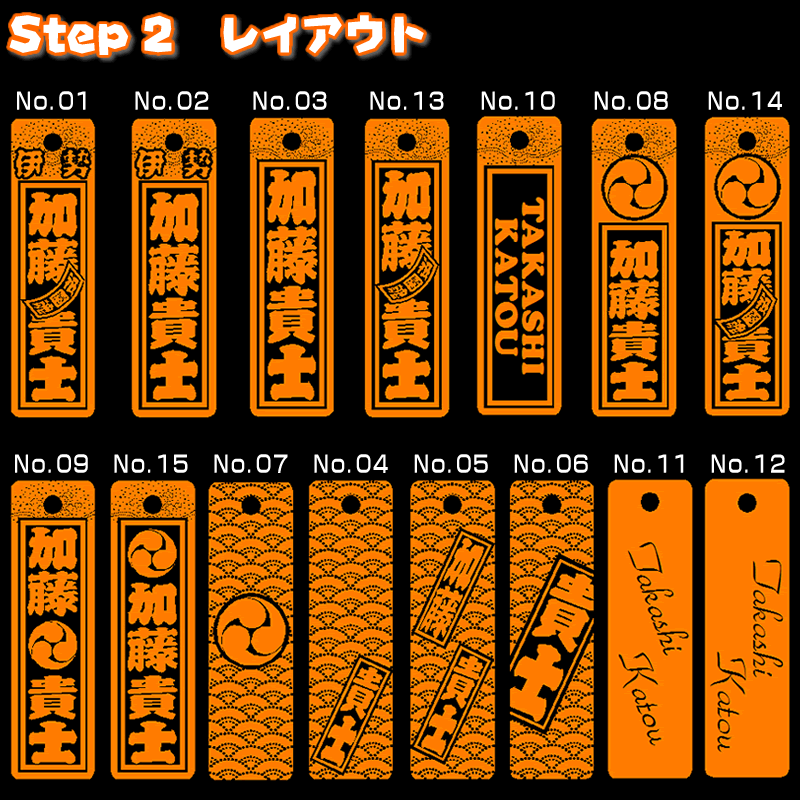 『注文を確定する』ボタンの画面にある備考欄に記入もしくは注文確定後にメールで作成内容をお知らせください・表はレイアウト問わず苗字、裏はレイアウト6でお名前のパターンが人気です。